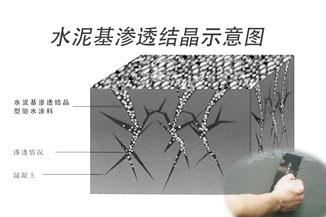 “水泥基滲透結晶防水材料”是一種灰色粉末物質,所含有的活性化學成分,會隨著水滲透進入混凝土結構的孔隙和縫隙中。在混凝土的微孔、微縫及毛細管中傳輸、充盈,催化混凝土內的微粒和未完全水化的成分再次發(fā)生水化作用,而形成不溶性的枝蔓狀結晶并與混凝土結合成為整體,阻止來自各方向的水及有害物質,而且該種活性物質具有一種催化特性,能夠不斷活化混凝土中未反應完全的水泥粒子或者結晶較差的物質,因此它能夠不斷的循環(huán)利用。只要有水存在,它就能不斷地起催化作用,使混凝土中的硅酸鹽物質進一步結晶化,從而起到防水作用。當沒有水分時,其中的活性成份保持靜止狀態(tài),但當再與水分接觸時,上述的化學作用及致密過程便會重復發(fā)生。因此混凝土結構即使局部受損滲漏(裂縫小于0.4mm) 在結晶作用下,會自行修補愈合,并具有多次抗?jié)B能力,從而在本質上改變了普通混凝土結構體積不穩(wěn)定而再次帶來的裂滲,因此具有永久的防水效果。根據(jù)ASTM、GB、JIS等標準測試完成的試驗,水泥基滲透結晶防水材料對混凝土結構不僅防水而且防止化學有害物質的侵蝕,保護混凝土具有極強功效。應用范圍: